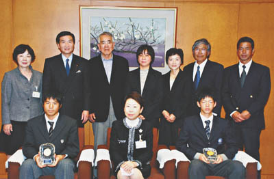 写真=近藤区長を囲む馬場選手(手前右)、天野選手(同左)と