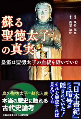 ①「蘇る聖徳太子の真実」飛鳥探真著、佐宗知佳編集/文芸社刊(1400円+税)この書の副題「皇室は聖徳太子の血統を継いでいた」と帯の宣伝文句「日本書紀には暗号が隠されていた!それを解読すれば見えてくる」「真の聖徳太子=蘇我の入鹿」というのが、本書が展開する主題である。