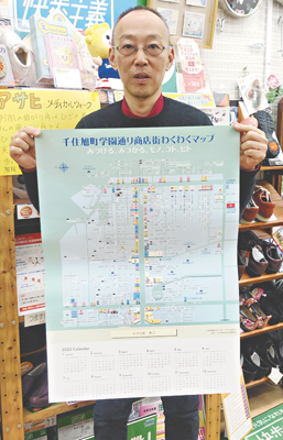 写真上/カレンダー付き商店街マップを手に石橋理事=サラダ館で