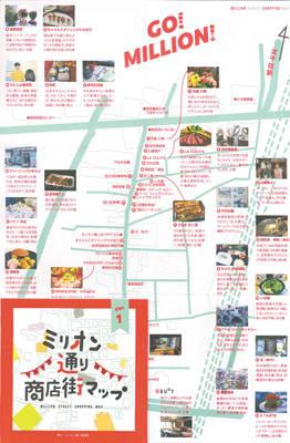 A3大の用紙の表は、通りの地図に25の加盟店(施設・会社)を置き、希望したお店には、おススメの商品や外観の写真、簡単な紹介記事を掲載。裏には8店(施設)の店主らのインタビューも載せた。表裏に「GO!MILLION!」の赤文字が躍り、6つ折りにしてしまえるオシャレな地図になっている。間嶋会長は「商店街にとっては厳しい時代ですが、ユニークな裏通りにしていきたい」と話した。