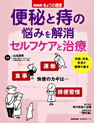 ★②NHKきょうの健康「便秘と痔の悩みを解消 セルフケアと治療」山名哲郎監修/NHK出版/900円+税10代から始まる女性の便秘、幅広い年代で起こる男性の痔ろう、出産後にみられる直腸瘤や便失禁、男女共に中高年に増えるいぼ痔、大腸癌検査が必要な50歳以降の血便等、これらが一目瞭然のイラストが、まず目に飛び込む。