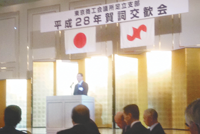 ◆商工会議所足立支部賀詞交歓会に250人東京商工会議所足立支部(高杉浩明会長=足立成和信金理事長)の新年賀詞交歓会が1月19日(火)、浅草ビューホテルで開かれ、来賓を含め250人が参加し、新年の決意を固め合った。福本勝由副会長(大作輸送社長)の開会の辞の後挨拶に立った高杉会長(写真)は「大企業は好景気だと言っているが、中小零細企業の景気の回復は遅れている。商工会議所は、設備投資などへの融資など皆さんのご要望に迅速に応えたい」と話した。近藤区長らの来賓の祝辞、永年会員の表彰の後、飯島弘副会長(仁生堂会長)の乾杯の音頭で乾杯し、親しく懇談した。この中で、足立支部が開発・普及の先頭に立っている「あだち菜うどん」のPRが大々的に行われた。