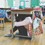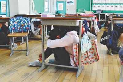 ◆3・11を教訓に地震から身を守るシェイクアウト訓練東日本大震災から4年目となる3月11日(水)、足立区役所、区内小中高校などで一斉にシェイクアウト訓練が行われた。身の安全を守る行動力の向上と、防災対策を改めて考え直す機会として実施。弥生小学校(巻島正之校長)では、午前9時半、校内放送と同時に全校児童576人が1分間、机の下に潜った。震災時に2年生だった子どもたちは、当時の行動を「掃除で机が全部後ろだったので、床に伏せた」「学校を休んで家にいたので、家族とテーブルの下に潜った。近くの友だちと集まって、怖いね、と話をした」と話す。シェイクアウト訓練については、「次に起こった時に素早く動くための訓練なので、しっかりやらないと、と思った」と感想。日常生活では、棚の上に物を置かないようにするなど、防災意識の高さが窺えた。どこにいても常に「今地震が起こったら」を想像し、頭の中でシュミレーションすることが、いざという時とっさに身を守る行動に繋がる。日々、「もしも」を心がけたい。