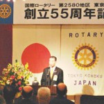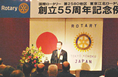 ◆東京江北ロータリークラブ・創立55周年記念例会東京江北ロータリークラブ(原田寛会長)の創立55周年記念例会(石鍋元章実行委員長)が、3月12日(木)、上野精養軒で開かれた。東京江北RCは、潤徳女子高校でのインターアクト(社会奉仕クラブ)や、昨年9月には55周年記念として区役所にAEDを寄贈するなど、区内で数々の奉仕活動を継続。また、東日本大震災で親を亡くした大学生を支援する「希望の風奨学金」の活動を行っている。例会前には記念卓話があり、静岡県立大学特任教授で軍事アナリストの小川和久氏が「日本人に国を守れるのか」をテーマに講演した。記念例会は会員56人中54人の出席により開会し、原田会長が活動報告と今後の支援を呼びかけて挨拶。また来賓の近藤区長が祝辞で、日頃の協力への感謝を述べた。その後の祝賀会では、全員が輪になって踊るなどパフォーマンスもあり、和気あいあいと親交を深めた。