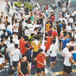 東口の東京電機大学東京千住キャンパス前には、千住旭町会、千住旭町自治会、旭町商店街振興組合、太郎山ラジオ体操会、足立学園、千住あさひ共同保育園、ルミネ北千住店の他、飛び入りも含め約400人が参加した(写真)。