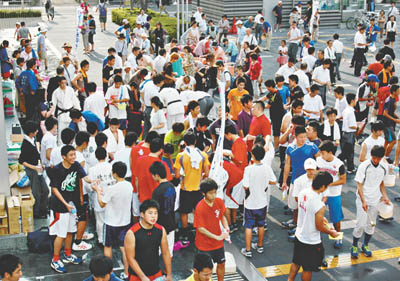 参加者にはキャップ代わりに取り付けるとペットボトルをジョウロとして使えるジョロPETを配布。区役所本庁舎で貯めた雨水各350ℓを20分程度でまき終わった。初参加の足立学園は生徒会が部活動をしている生徒に呼びかけ、運動部を中心に約200人が集結し、打ち水を楽しんだ。