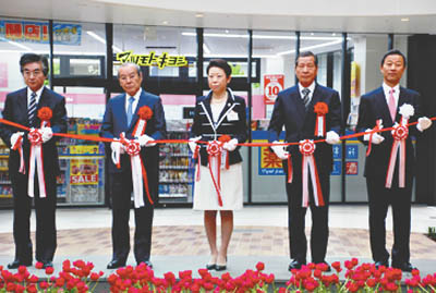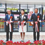 ◆「ポンテポルタ千住」がオープン4月18日(金)、京成千住大橋駅前(千住橋戸町)に、三菱地所が主導する大規模商業施設「ポンテポルタ千住」がオープンした。1階にスーパー「ライフ」、2、3階に「ヤマダ電機」など44店舗を揃える5階建ての商業施設で、しかも足立市場以外には商業施設がなかった北千住の南端地区とあって、開店には長い行列が出来、終日賑わった。午前9時半に始まったオープニングでは、駆けつけた近藤区長が「千住地区の計画施設が全部完成したことになる。ここが新拠点として発展することは間違いない」と激励、土地を提供した㈱ニッピの伊藤隆男社長は「9年前に始まった新しい街づくりの一つの節目になり、感慨無量です」と挨拶。林裕三菱地所リテールマネージング㈱社長、山田友計橋戸町自治会会長、近藤区長、伊藤社長、テナント代表の唐澤銀司㈱ヤマダ電機常務(写真右から)の5人がテープカットを行った。地元商店街への影響が心配されているが、1階「ライフ」そばに千住緑町商店街などのアンテナショップ「ポンベール千寿」(TEL3882・6334)もオープン、特注の洋菓子などの販売に声をからしていた。