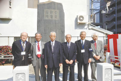 ◆森鷗外ゆかりの記念道碑を移設・整備明治の文豪・森鷗外が原稿を寄稿、大正5年(1916)に建立された「大正記念道碑」が、新たな安住の地を得て、千住中居町公園に移設された。4月27日(日)関係者が集まり、除幕(写真)と講演会が行われた。「千住の鷗外碑保存会」(飯島弘会長)が主宰したもので、この事業には、区の公益信託まちづくりトラスト助成が活用された。千住大川町から千住中居町にいたる大正記念道(現在の大正通り)の敷設を記念して千住宮元町29-1に建てられた記念碑は、軟弱地盤のため大規模地震などで倒れる恐れが出たため、大正通りに面した同公園への移設となった。除幕の後、近くの青葉中学校で山鷗一頴鷗外記念会会長による記念講演会が行われた。