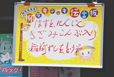 ◆柳原商栄会/キデンキ伝言板&商店会マップ完成柳原商栄会(立花千里会長)では、このほど地域活性化のため「キデンキ伝言板(メッセージボード)」と「商店会マップ」を作成した。キデンキくんのイラストの入った伝言板は、加盟店27店舗に設置。営業時間やお買い得情報、花の見頃など様々なメッセージが書かれている。商店会マップでは、お店紹介のほか、イベント情報も掲載。マップは加盟店に置かれているほか、イベントでも配布予定。【メモ】キデンキくんとは=柳原地域の街灯として今でも20本以上が残っている木の電柱に傘付き電球をつけた「木電気」をモチーフにしたキャラクター。HP・【問合せ】TEL3888・3577ゑびす屋