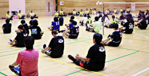 写真/準備体操もしっかり念入りに行い試合へ=伊興センター体育館で