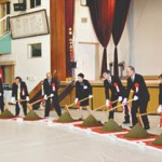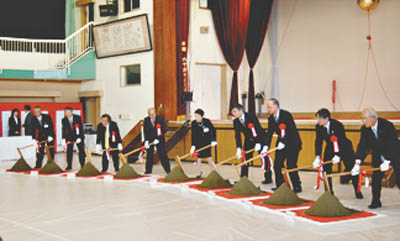 近藤区長は「鉄道高架化が最終目的ではなく、足立区の北の玄関口にふさわしい竹ノ塚駅周辺のまちづくりを通じて、地域の更なる発展を目指し、取り組んで生きたい」と挨拶。関係者らが工事の安全を祈願して鍬入れを行い(=写真)、式の最後は十四中吹奏楽部による祝賀演奏で締めくくられた。