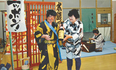演目は「瞼の母」。お馴染みの人情ものだが、コーシャハイムの清掃係の男性(=写真左)や、白翁会(老人会)のメンバーなども役者として登場すると、アドリブの迷演技に客席は大笑い。最後は座長が悲痛な母の思いを熱演、感動で締めくくった。