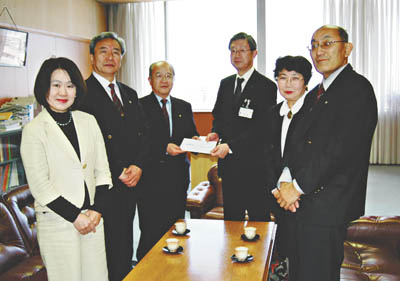 千代田商店街(山川吉三理事長)が、4月8日(金)に区役所の区民課を訪れ、義援金を丸山亮区民部長に手渡した。