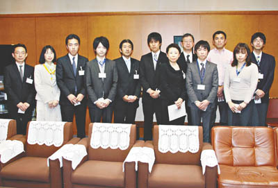写真/区長から激励を受けた派遣職員たち=区役所で