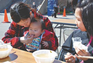 3月27日(日)、東日本大震災の避難所の1つになっている綾瀬にある東京武道館で、足立市場協会(米澤照雄会長)が約400人分の「ねぎま鍋」と「おにぎり」を被災者に振る舞った。