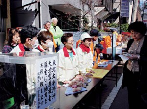 3月27日(日)、綾瀬五丁目商店街(足立義夫理事長=「肉よし」店主)で行われた「桜まつり謝恩大イベント」で、同商店街が東日本大震災の被災者のために募金活動を行った。
