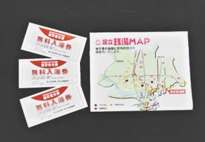 東北地方太平洋沖地震で被害に遭われ、東京武道館に避難している被災者に、東京都公衆浴場業生活衛生同業組合足立支部と足立区が3月31日(木)、区内の46カ所の銭湯で使用できる「無料入浴券」を配付した。