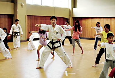 午前中の道場生の部では、世界大会金メダルなどの実績を持つ姜昇利(カンスンリ)副師範が指導。午後の体験会の部は、初心者など十数人の参加者に、野本会長がストレッチや型の基本を教えた。
