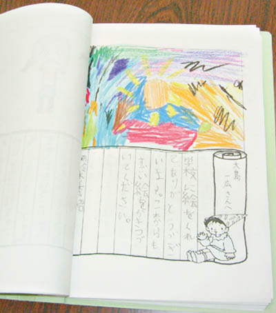 感謝状の贈呈式は、母校の花畑小で行われた。校長室では、山野辺泰子校長と3年生の女子児童が、「大島さん、素適な絵をくれてありがとう」などのお礼の言葉が絵とともにつづられた児童たちの文集が手渡され、大島さんは感激。