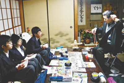 続いて、江北高校定時制を訪問。「PTA学習会」として、足立朝日でも数度取り上げたドキュメンタリー映画「月あかりの下で」の上映が決定したことを縁に、同校の宮川隆史副校長を取材(詳細は3月5日号参照)。この春に3年生になる豆記者たちは、全日制と定時制の違い、学年制と単位制、学科の種類、学校の選び方などのアドバイスも受け、漠然としていた高校への知識を得た(写真中)。さらに、地域に根差して様々な改革に取り組む公立高校の「頑張る姿」を知った。最後に、のこぎり音楽演奏家の「のこぎりキング下田さん」を取材(詳細は3月5日号掲載予定)。のこぎりで奏でられる音楽を初めて聴いた豆記者たちは興味津々(写真下)。実際にのこぎりに触れ、音を出せるかどうかに挑戦したところ、思いがけずに良い音色が。下田さんは「諦めずに努力を重ねれば、夢は必ず叶う」と語りかけた。