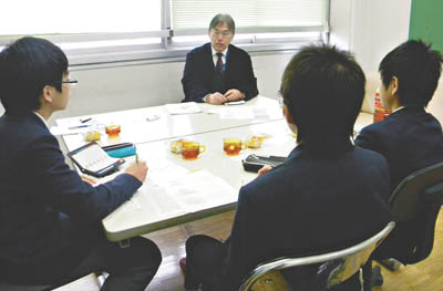 足立区立第十三中学校(青木忠雄校長/神明南1丁目)2学年の(写真上=後列左から)並木優君、遠山将士君、大野拓海君が職場体験の一環として記者体験を希望。オリエンテーションで名刺交換方法や記者の心得を学んだ3人は、2月1日に豆記者として現場へ。古性重則区議が足立区議会の議長就任時、足立朝日恒例の取材を終えていないため、これを機に豆記者たちはまず古性議長を取材。「なぜ議員になりたいと思ったのか」「議長就任の感想は」「議長に就任して良かったこと、大変なこと」などの質問に、古性議長は丁寧に回答(詳細は3月5日号「人」欄掲載予定)。さらに豆記者のために、議場を案内して解説(写真上)。3人は、議長席の座り心地を体感したり、ボタンひとつで車椅子用の高さに調整できる質問者席の存在に驚くなど、未知の世界に触れて目を輝かせた。