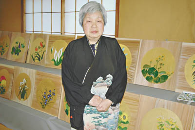 リフォームの裁縫教室を開いている山崎さんは、24年ほど前から趣味で墨絵や日本画を勉強。琳派の画家、酒井抱一の直系・六世抱道の指導を受けるなどして、描き続けてきた。
