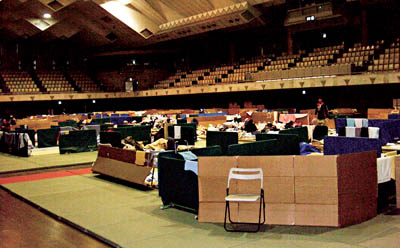 綾瀬駅近くにある東京武道館では、約300人の避難者が生活している。原発による避難のため、身の周りのものを持って来ている人が多く、被災地の避難所とは状況が異なる。食事は食事券が配られるなど、物資面の支援は武道館管轄の都によって、比較的行き届いているようだ。避難者の20代男性は、「足りない物はない。十分な暮らしをさせてもらっている」。当初、都が衛生面などを考慮してボランティアの受け入れに消極的だったことに対し、「寒い中、手続きに何時間も外で待っているボランティアの人もいて、そちらの方が体を壊してしまう」と逆に気づかう言葉も。