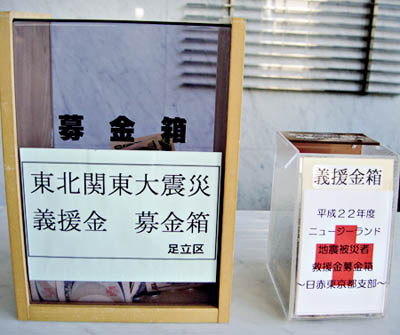 区役所などで義援金の受付 震災への足立区の義援金は、区民課がまとめて赤十字に送っている。各区民事務所、区役所北館1階と中央館ロビーの受付に募金箱が設置されているので、支援したい人は利用して欲しい。受付は9月30日(金)まで。