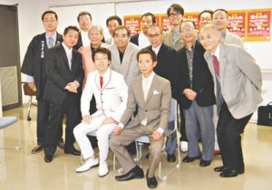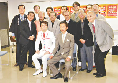 写真/「ロケット団」(前列の2人)を囲む漫才協会理事一同(中列左から3人目は青空会長)
