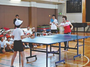 写真/平野選手と5・6年生が卓球対決=同校体育館で