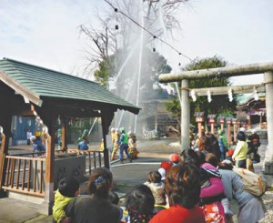 一斉放水は、消防団、自衛消防隊及び消防隊により実施。境内には参拝客をはじめ、近隣の幼稚園、保育園からも多数の園児が見学に訪れ、多くの人が息を飲んで演習に見入っていた。一斉放水が実施されると「虹も出ているよ!」「消防車の水ってすごい!」と園児から大歓声が上がった。