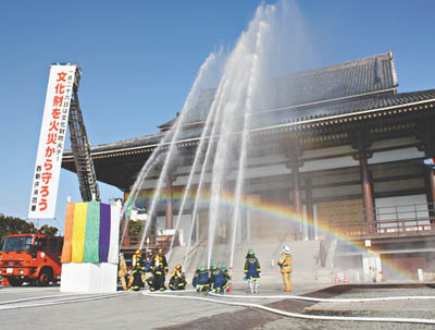 西新井消防署(上條武夫署長)では、文化財防火デーの1月25日(金)、西新井大師で消防演習を実施した。