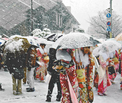 写真上/大雪の中歩く新成人たち=東京武道館前で