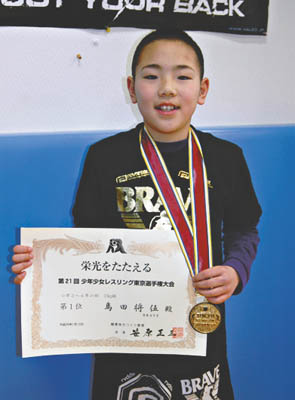 格闘家・宮田和幸さん主宰のジム「Brave」(千住3)に所属している烏田将伍くん(常東小4年)が、1月12日(土)、第21回少年少女レスリング東京選手権大会(健康体力づくり教室主催)=国立オリンピック記念青少年総合センター=で、33㎏級・初優勝した。
