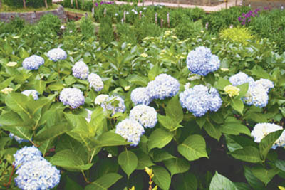 しょうぶ沼公園では、この季節、アジサイも咲いてきれい。しょうぶ田の南側、東屋との間に約100株が植えられている(写真)。