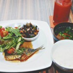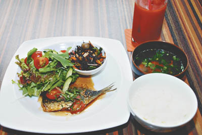料理は、肉か魚のメイン料理にカウンターにある大皿から副菜2つ、ライス、スープ、ドリンクがついて800円。その他、日替わりでタイのカレーや韓国のソーメンなど多国籍料理も人気。店内で食べる時間がない人は、日替わりの持ち帰り弁当もある。ただし数に限りがあるためお早めに。