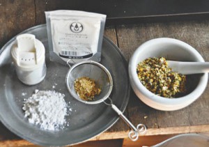 大人も赤ちゃんも安全に使えるボディーパウダーだ。材料はハーブパウダー(ドライのカモミールジャーマン)大さじ1、コンスターチ大さじ3。作り方は、ドライハーブをミルサーまたは乳鉢で粉末にし、茶こしで濾し、コンスターチに混ぜる。そしてもう一度茶こしでふるい容器に入れ出来上がり。