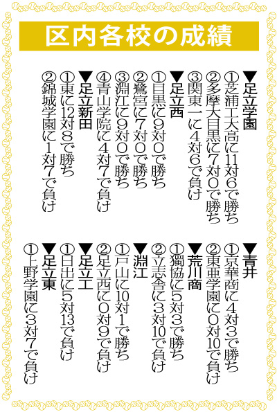 高校野球は地方大会も終わり、8日(木)から始まるが、足立区から参加した8校も奮戦。トップは、4回戦まで行った足立西と、同じく4回戦で優勝候補・関東一を震え上がらせた足立学園など、足立っ子は頑張って来年につなげた。