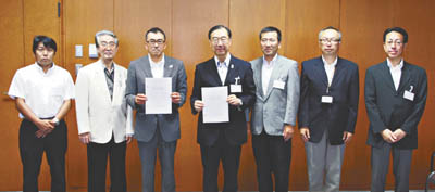 石油商業組合足立支部には、現在60事業所が加盟し、59カ所のガソリンスタンドを経営している。平林支部長は、「現在都と区の助成により区内8カ所のガソリンスタンドが自家発電装置を完備しており、ここではすぐに今回の協定のような災害時対応が出来るが、ほかのスタンドについても対応を急ぎたい」と語った。写真/左から、石油組合の吉村美知明副支部長、吉村知代司前支部長、平林秀太支部長、石川副区長、川口危機管理室長、山下防災計画担当課長、宇田川災害対策課長