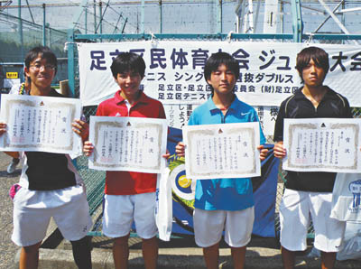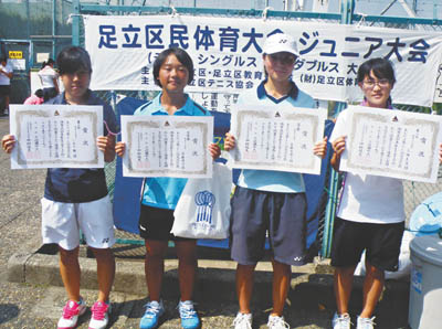 ▼シングルスB1(高3男子)=①木村雄也(足立)②山田航己(足立学園)③鈴木将宇(同)、数間友斗(足立西)▼同B2(高1以下男子)=①宮地俊輔(早稲田大高)②大野慎平(八幡中)③山本健登(成徳高)、長谷川哲也(足立新田)▼同G1(高3女子)=①高橋愛樹子(足立東)②須藤優凪(ネオ西新井)③小見山楓(潤徳)、大堰美笛(江北)▼同G2(高1以下女子)=①高橋杏奈(十四中)②古姓美舞(七中)③桑原葵(ネオ西新井)、鵜澤結(淵江)▼ダブルスBW(高校男子)=①金子・桑山(成徳)②江川・数間(足立西)③木村・村上(足立)、坂井・川井田(足立学園)▼同GW(高校女子)=①江川・石田(足立新田)②小見山・小森(潤徳)③小西・小又(淵江)、鵜澤・原田(同)