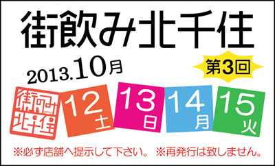 実行委員会主催の「街飲み北千住」の第3弾が、10月12日(土)~15日(火)に開催される。