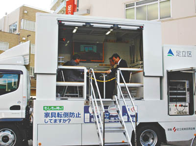 14年間活躍した2代目の買い替え時期にあたり、足立成和信金から区に全額寄付があったもの。地震体験車はオーダーメイドのため、約2700万円。新「震太くん」は、これまでの水平方向の動きだけでなく、同時に垂直方向にも揺らすことができるため、よりリアルに地震の揺れを再現。また、東日本大震災や阪神大震災、今後想定される大地震など、16種類の揺れを体験できる。
