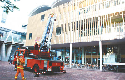 9月13日(金)、東京電機大学千住キャンパス(古田勝久学長)で、学生・職員502人が参加して「災害対策訓練」が行われ、千住消防署(今和泉健一署長)の協力で、はしご車による救助訓練も実施された(写真)。今回は、新潟県中越沖地震と同じ震度6強の大きな地震が発生したことを想定した訓練。訓練が始まると、1~4号館にいた学生・職員らは、冷静に状況判断しながら避難を開始。地震により発生した火災で逃げ遅れた生徒4人は、はしご車を使い3階から救助した。訓練終了後は消火器訓練も行われ、多くの学生たちが万が一のためにと参加、千住消防署の署員から使い方や、火災の際に心掛けることを真剣に聞いていた。