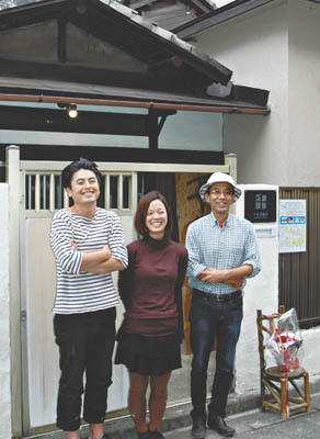 写真/左からスタッフの服部信吾さん、梶野晴香さん、加賀山代表=千住芸術村オフィス前で