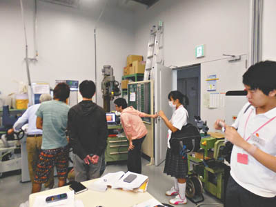 2人は、足立朝日編集室にほど近い東京電機大学千住キャンパスから取材を開始。まず、西に富士山、南に東京スカイツリーが見える眺望のいい11階の部屋で、総務部の村上隆之課長から大学の歴史、理念、教えている内容などの説明を受けた。その後、大学内を回り、実際に旋盤加工の授業風景を取材。