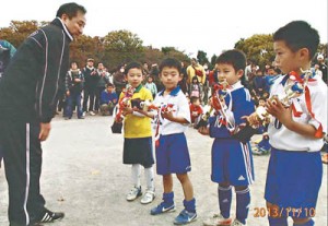 写真/深沢晃大会会長からカップを受ける幼児たち=舎人プレイグラウンドで
