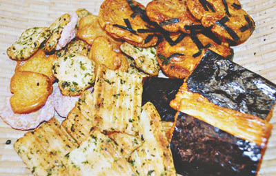 「お客さんの要望に応えたい」と新しく「しょうが醤油」や「マヨネーズ」にチャレンジして新あられを製造販売している。店頭には約60種類の中から売れ筋の商品を並べている。全品1袋500円。小分け1袋110円。地方発送もしてくれる。