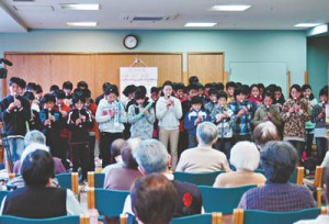子どもたちはデイサービス利用者の前で歌とリコーダーを演奏し、「今回でさくらでの交流会は最後なので残念です。これからもお元気で」「中学へ行っても頑張ります」と挨拶。新井とし理事長から感謝状が贈られた。