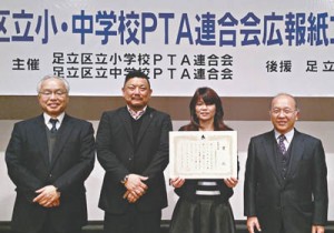 3月5日(水)、足立区役所庁舎ホールで平成25年度足立区立小学校・中学校PTA広報紙コンクール(両連合会主催)の表彰式が行われた。