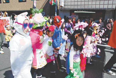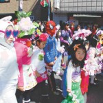 3月22日(土)、五反野駅前通り銀座会(原口香寿子会長)が、「第2回 こども仮装コンテスト&区立第十一中学校マーチングパレード」を実施。四ツ谷交差点からサミット五反野店までをパレードした(写真)。昨年から「商店街に賑わいを」とスタートしたイベントで、今年は約50人のちびっ子たちがかわいい仮装で参加。全身緑色でブロッコリーを手に持ったブロッコリーマンや、ウサギの耳とシッポをつけた子など様々。仮装パレードに参加した子どもたちは、パレード終了後に商店街の加盟店を巡るスタンプラリーに挑戦。その後、中央本町地域学習センターで仮装コンテストが行われ、優勝者に東京ディズニーリゾートペアチケット、2位以下の子たちに同商店会の商品券が授与された。